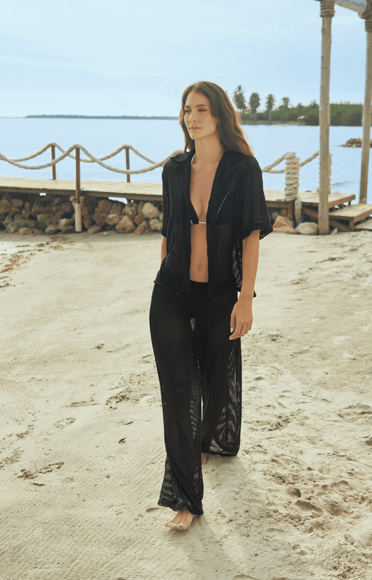 Pantalón playero negro largo ancho en malla Shell