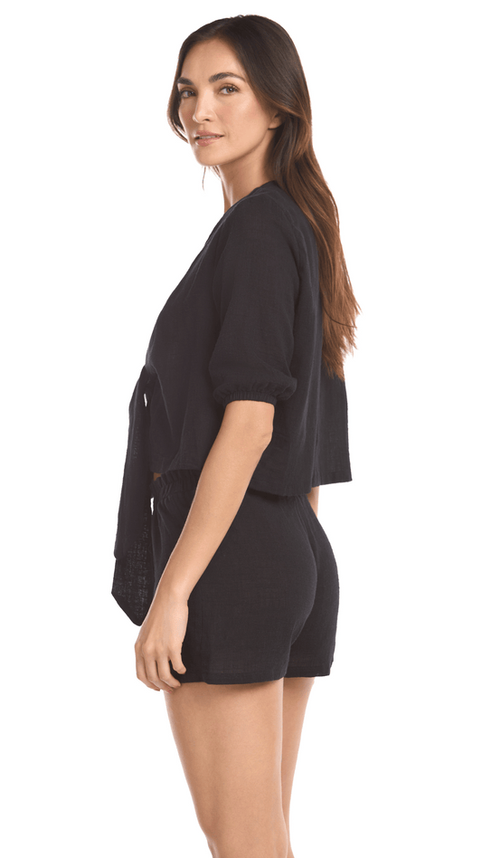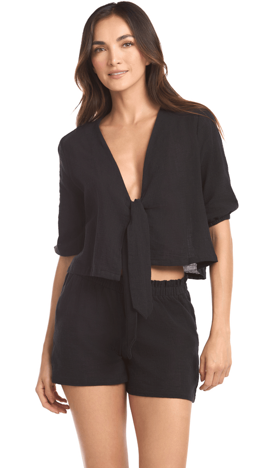 Salida de baño camisa corta negra con amarre frontal en tela con textura Polux
