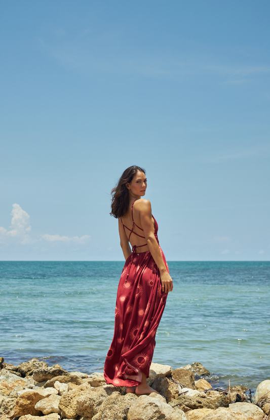 Vestido de playa largo vinotinto estampado soles con escote y tiras decorativas Ipanema