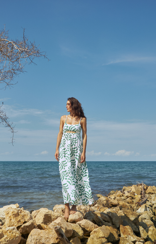Vestido de palya largo verde estampado tela fresca con abertura decorativa Rosario